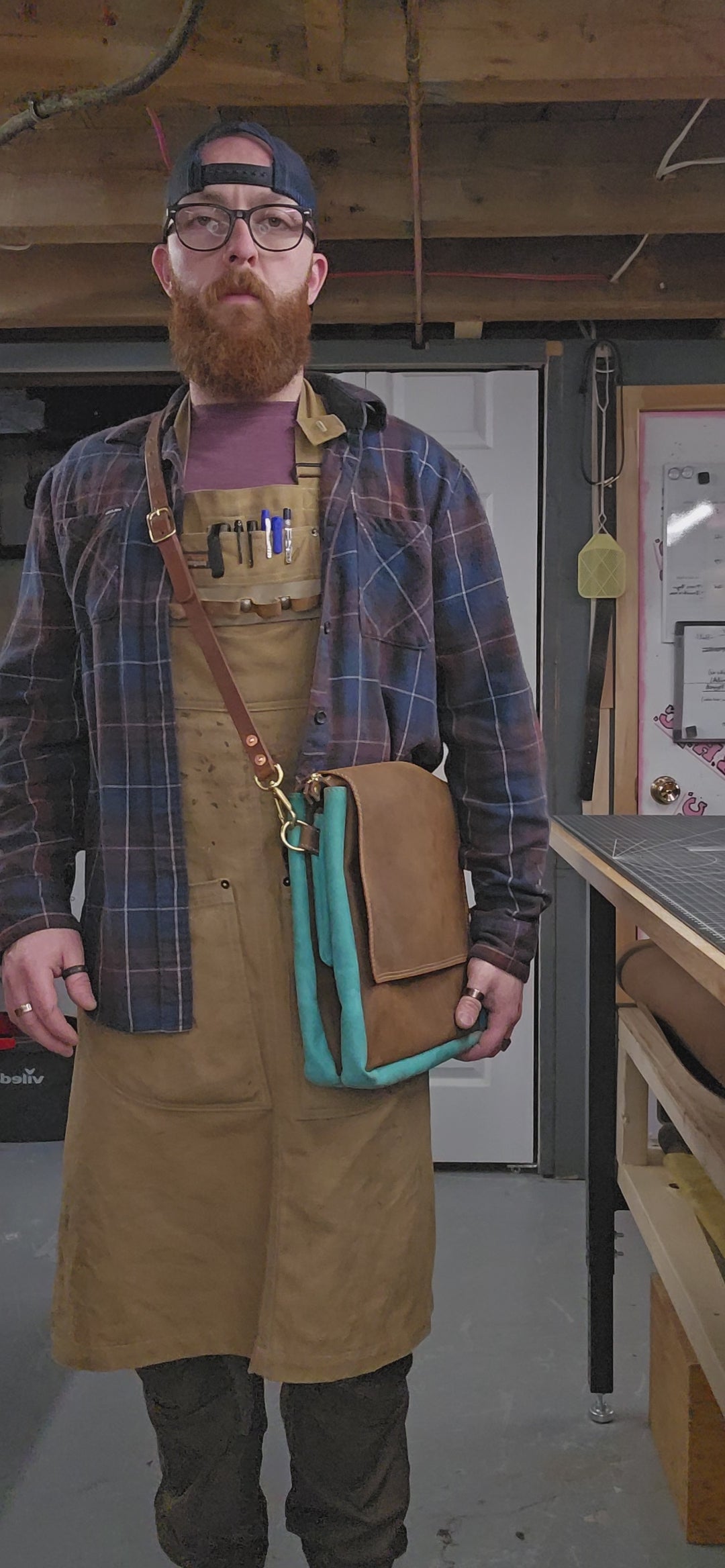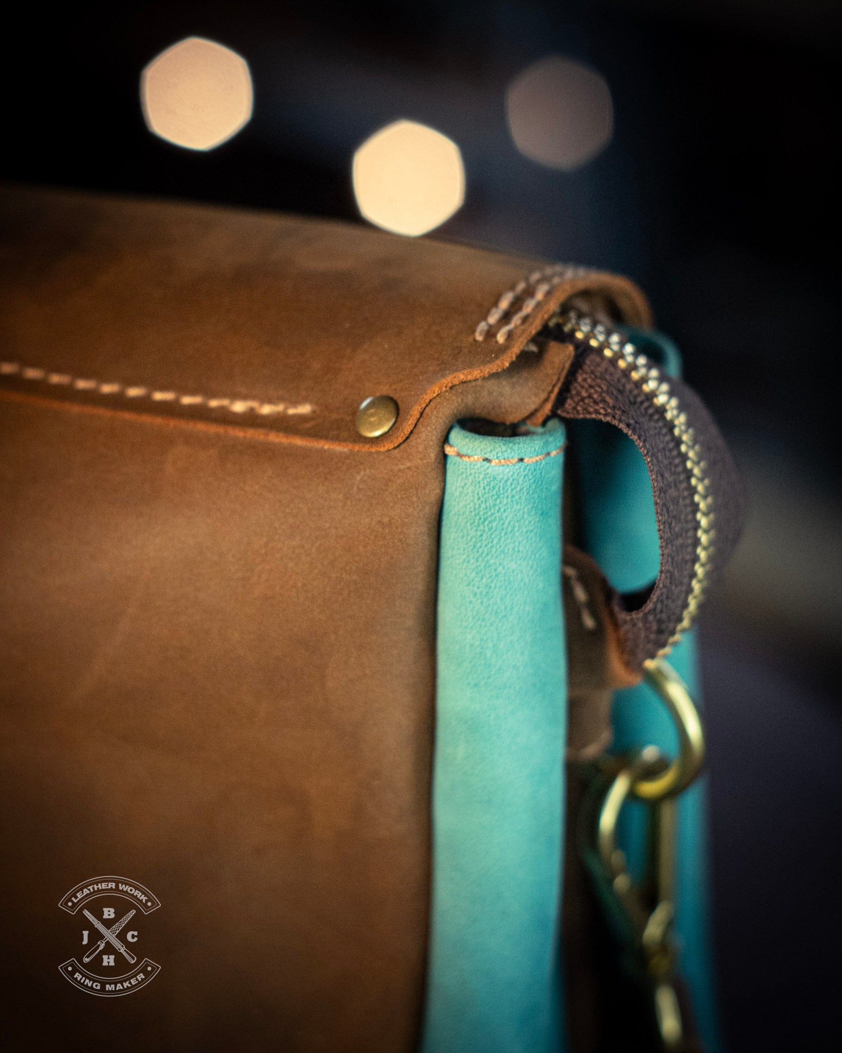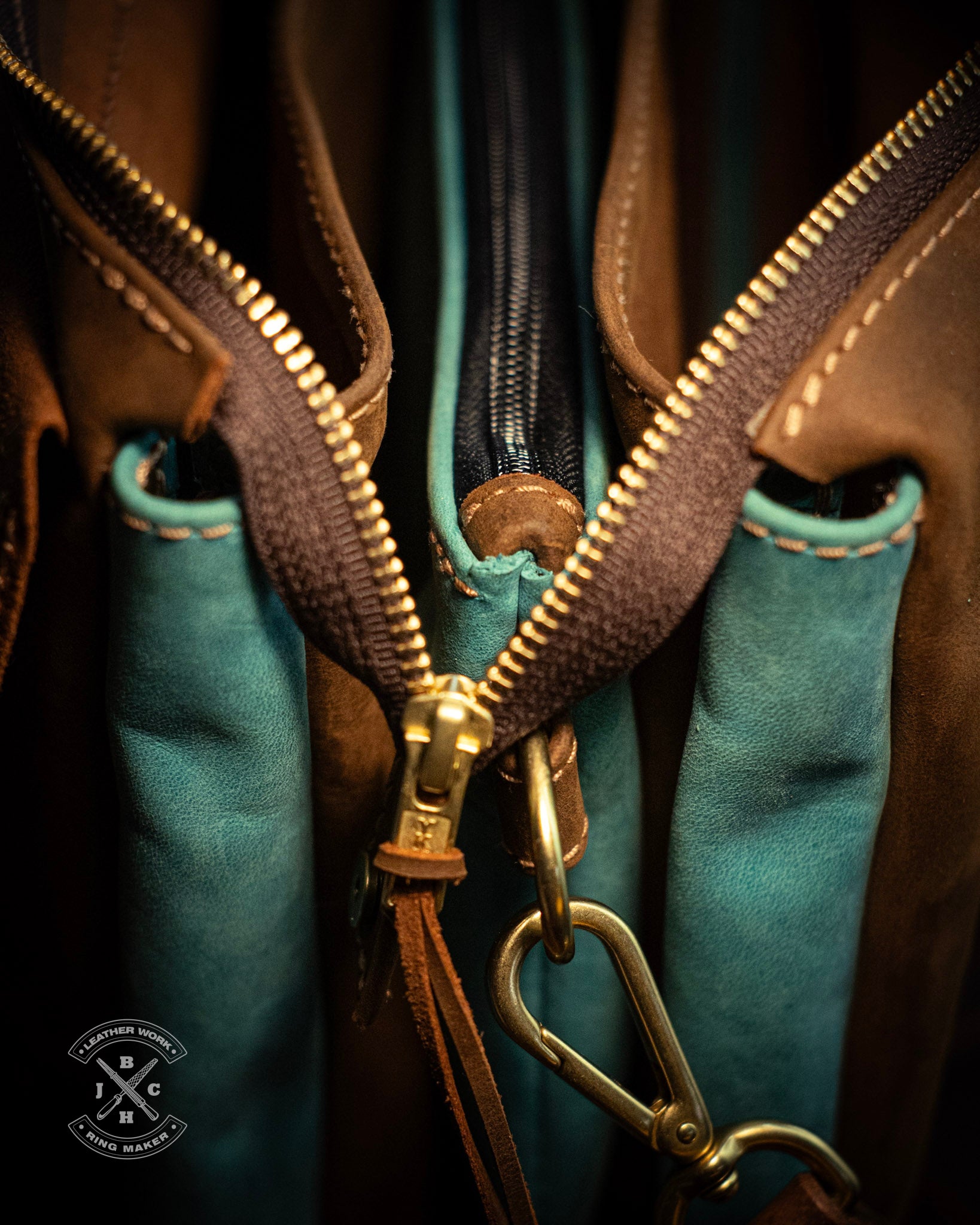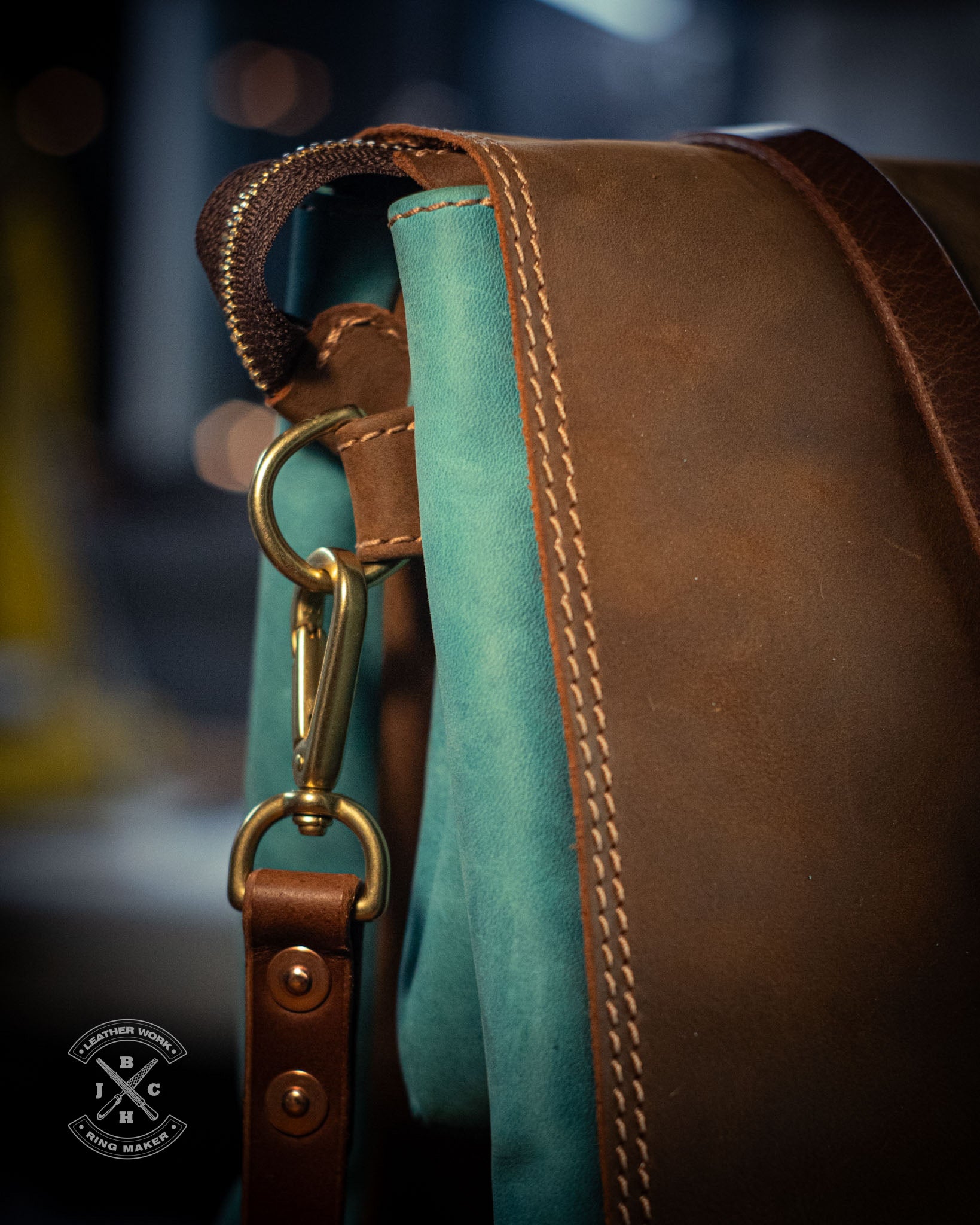 The Hammond is a spacious yet slim leather bag made from turquoise blue and brown *Crazy Horse leather. It features five compartments to keep your essentials organized, while a clean flap adds both neatness and security. I used natural brass hardware, tan stitching, and YKK zippers for durability and style. Magnets at one end of the zipper allow the opening to widen, giving you easier access when you need it.